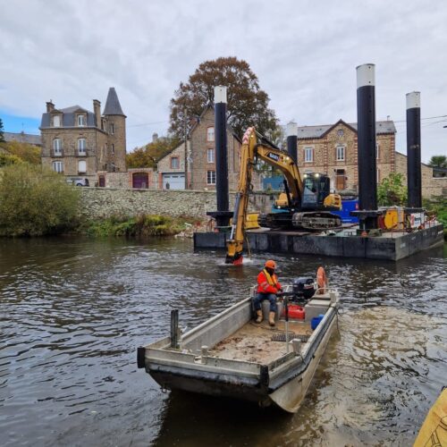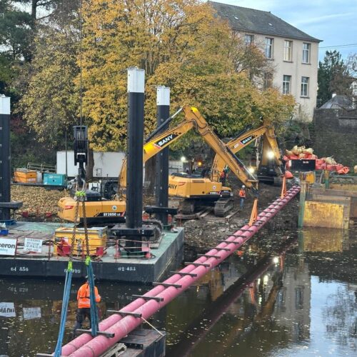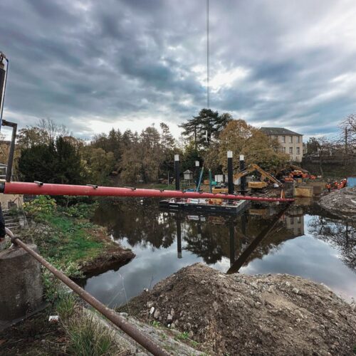 SCR est intervenu à Mayenne pour le franchissement de la rivière sur 50 mètres dans le cadre d’un projet mené pour ENGIE. Le génie civil a réalisé plusieurs centaines de forages dans la roche avant le terrassement guidé GPS directement en eau.