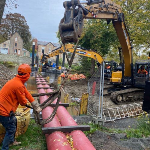 Nos équipes ont assemblé un fourreau DN 400 en deux sections, dans lequel a été inséré un DN 150, posé sur collier centreur et sécurisé par une triple étanchéité. La mise en place a mobilisé un important dispositif de levage ainsi que des plongeurs-scaphandriers pour garantir la précision et la sécurité des opérations.