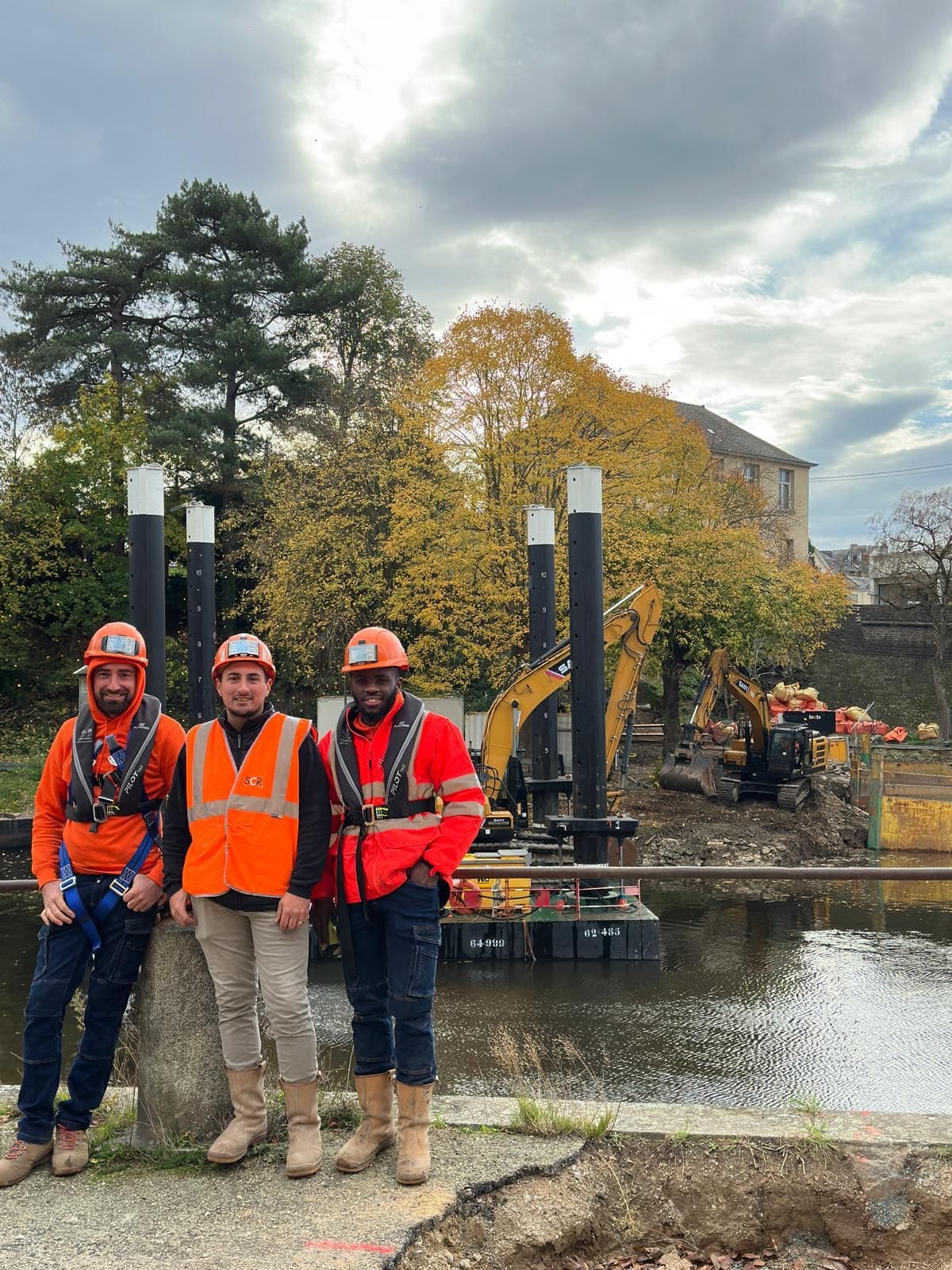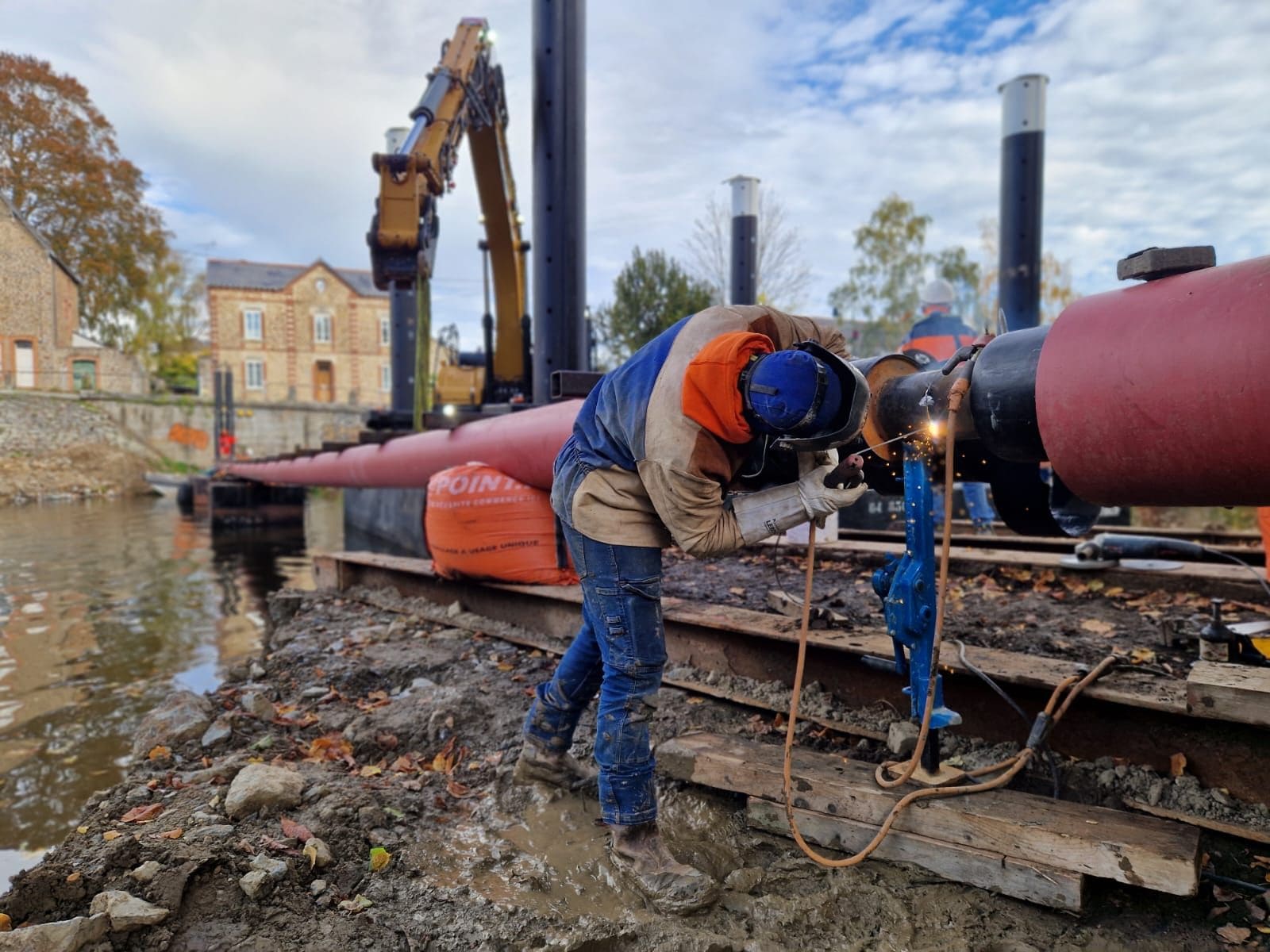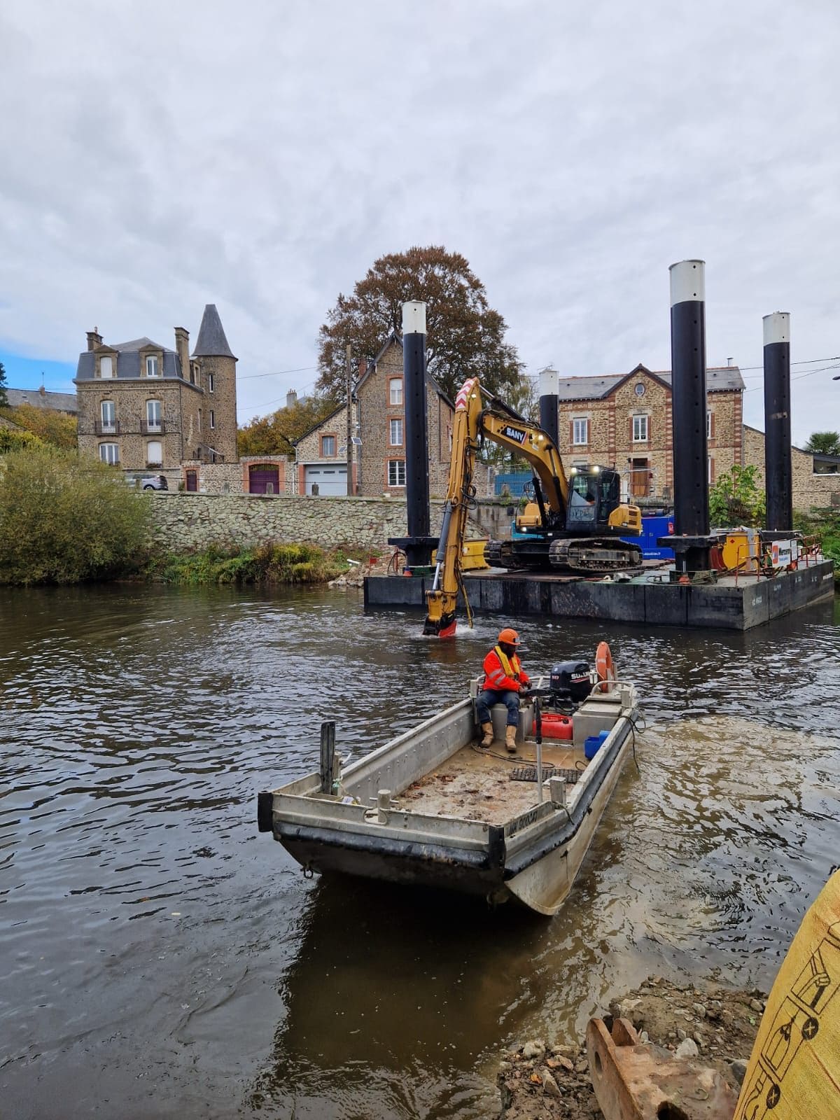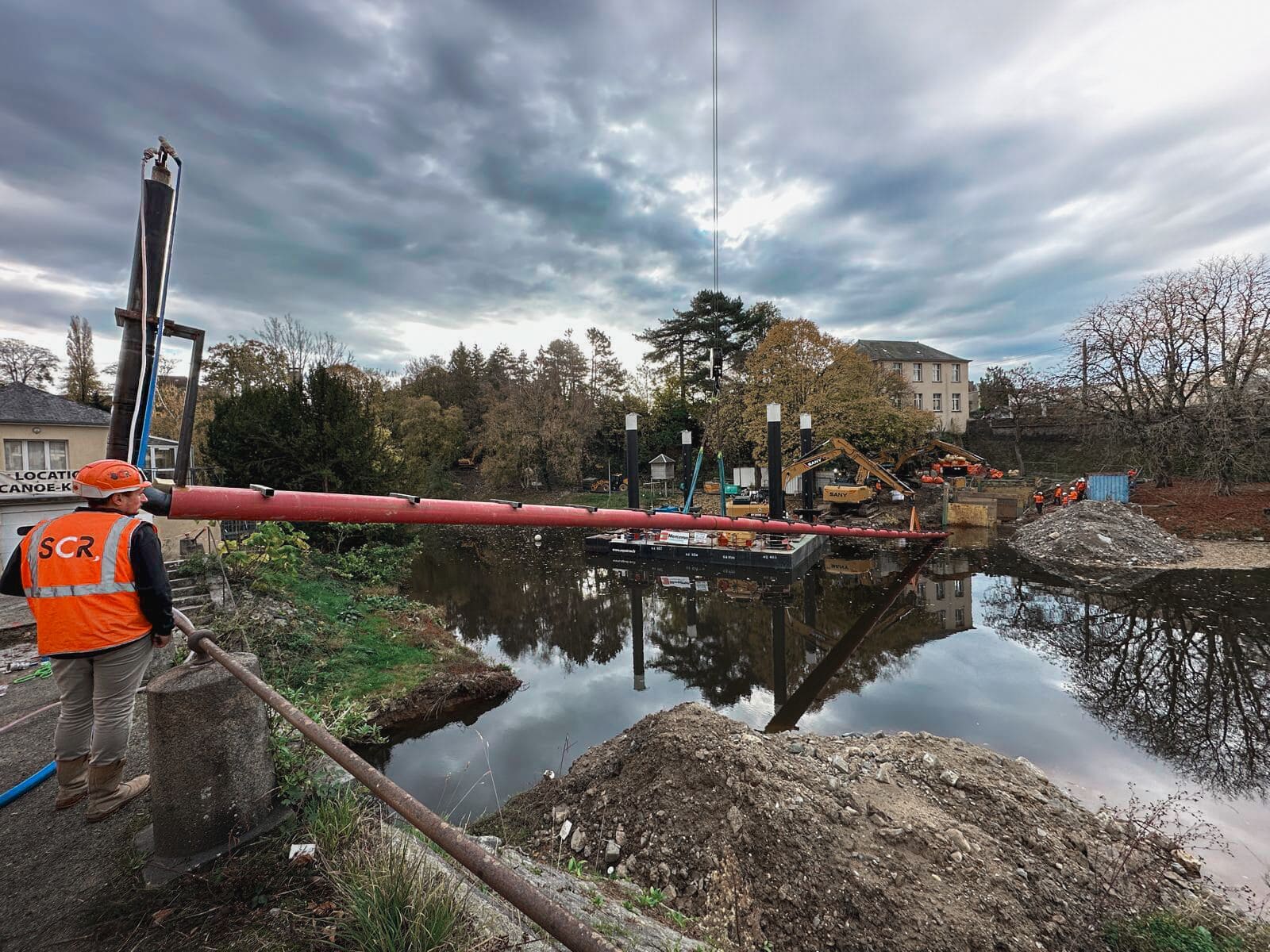 SCR est intervenu à Mayenne pour le franchissement de la rivière sur 50 mètres dans le cadre d’un projet mené pour ENGIE. Le génie civil a réalisé plusieurs centaines de forages dans la roche avant le terrassement guidé GPS directement en eau.