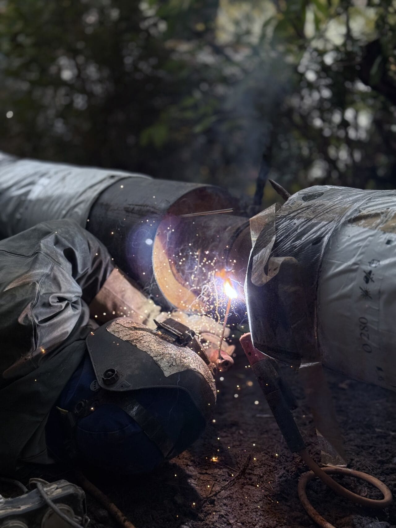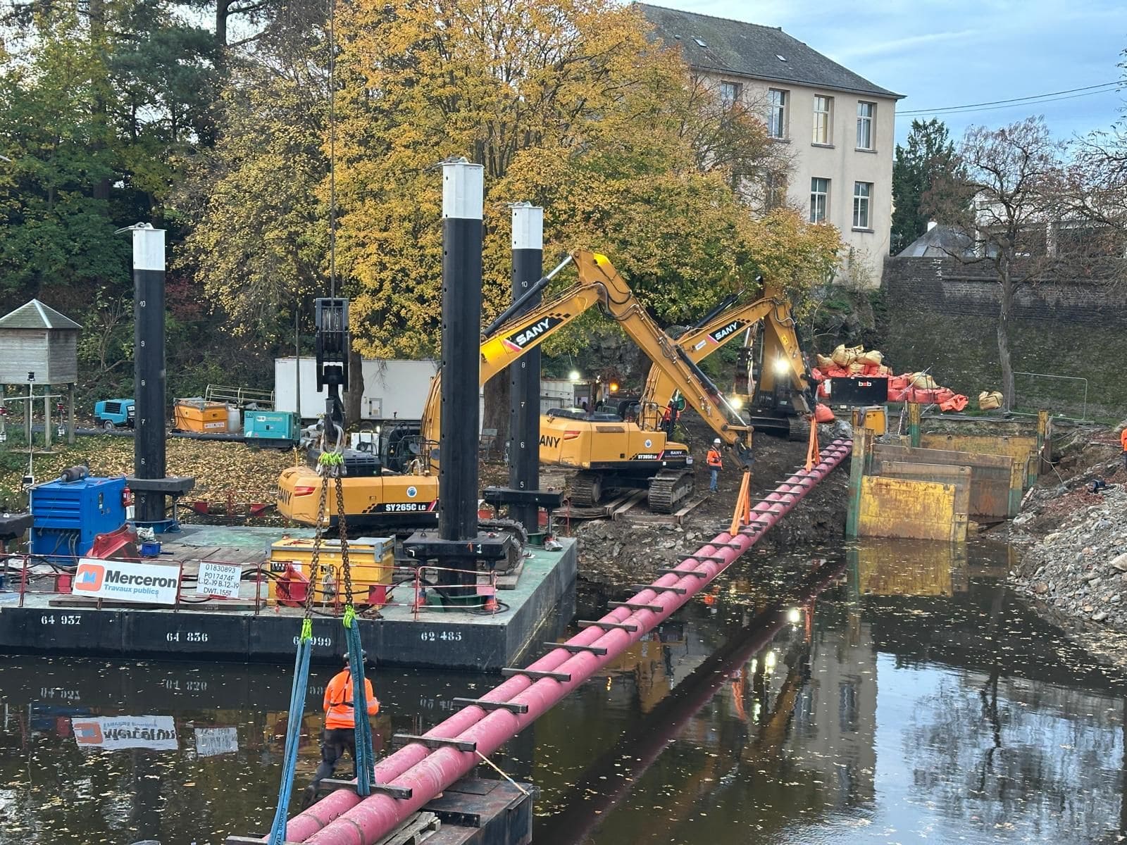 Nos équipes ont assemblé un fourreau DN 400 en deux sections, dans lequel a été inséré un DN 150, posé sur collier centreur et sécurisé par une triple étanchéité. La mise en place a mobilisé un important dispositif de levage ainsi que des plongeurs-scaphandriers pour garantir la précision et la sécurité des opérations.